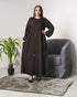 A classic, dark brown abaya with an optional belt-like ribbon that can be tied around the back or front of the robe into a bow style for a more elegant